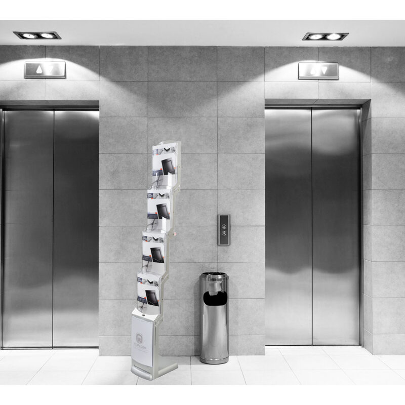 Samme smarte brosjyrestativ som RealZip bare med aluminiumsdetaljer i pulverlakkert hvitt. Dette brosjyrestativet skiller seg virkelig ut fra mengden brosjyrestativ. Leveres også med 2, 3 og 6 hyller.